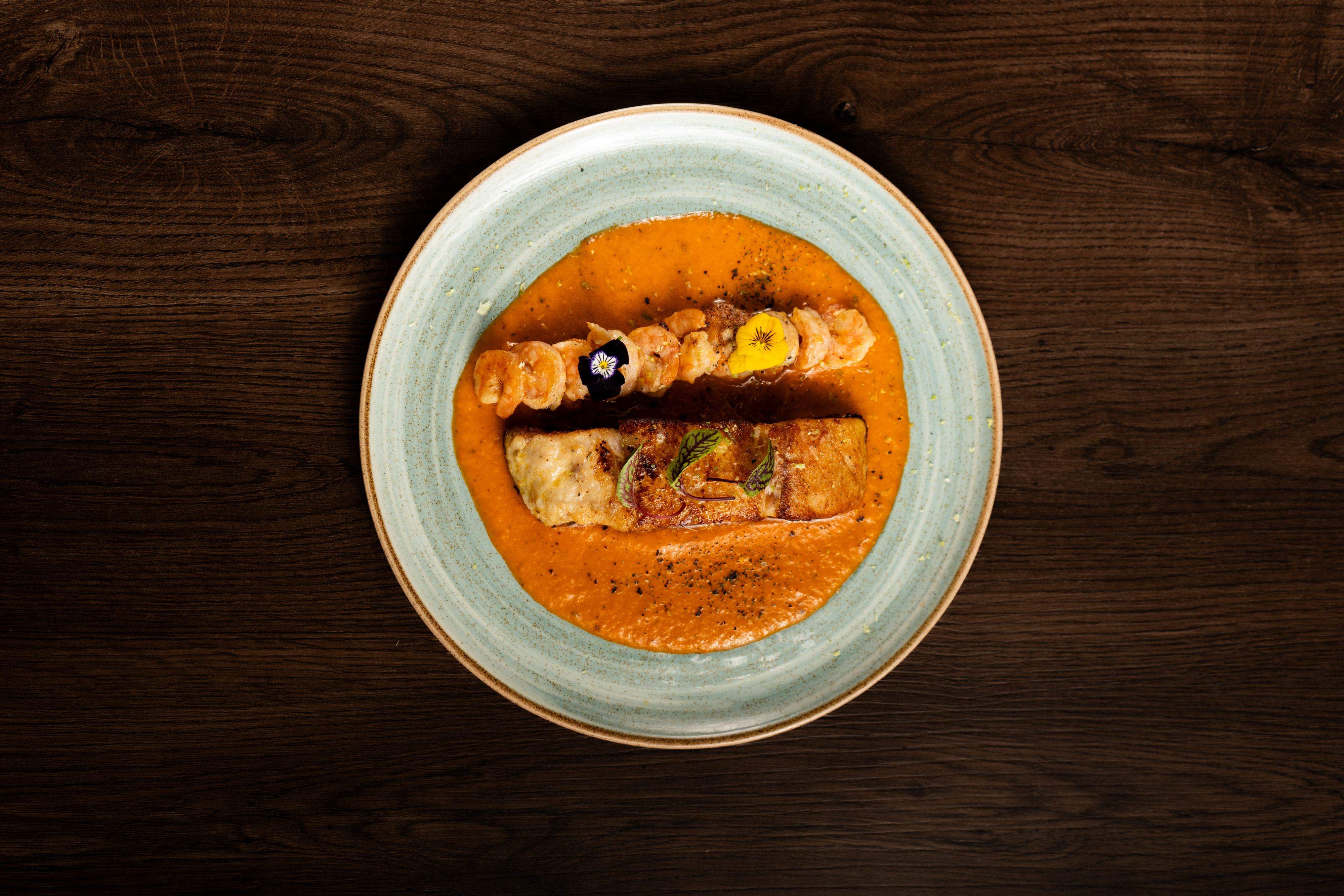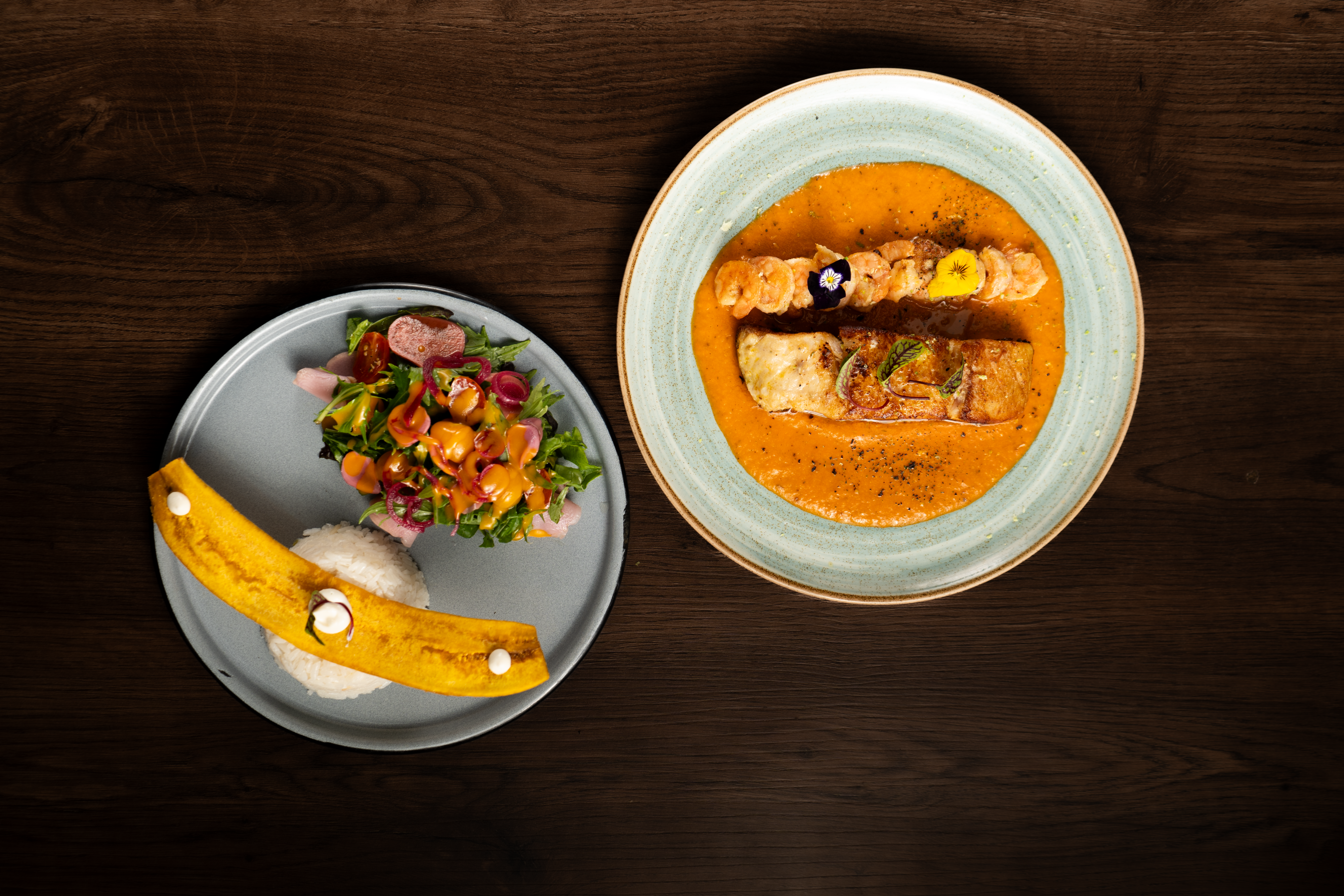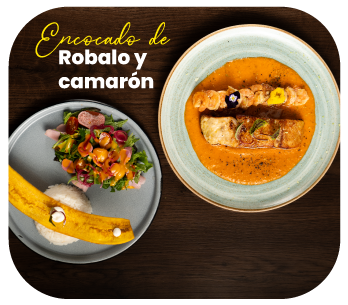 Pesca blanca de temporada, con camarones flambeados en viche, sobre una exquisita salsa encocada del pacifico, aromatizada con hierbas de azotea, arroz blanco o de coco y crocantes de plátano.